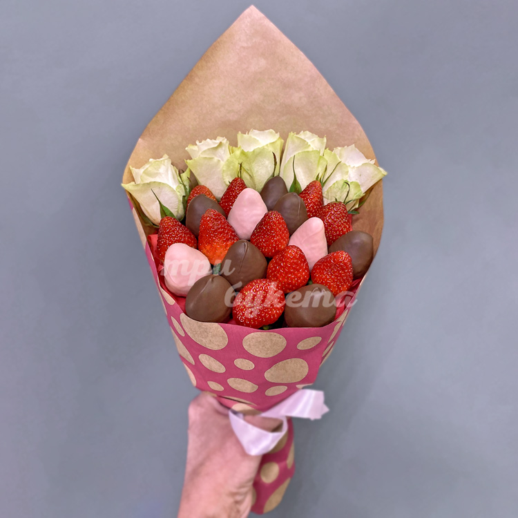 Букет из 5 белых роз и клубники