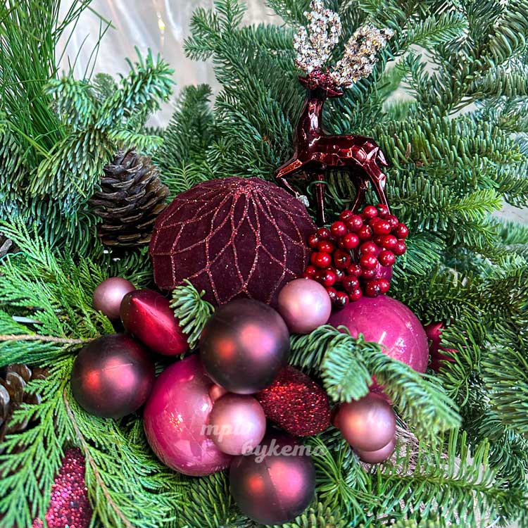 Хвойная композиция с бордовыми игрушками