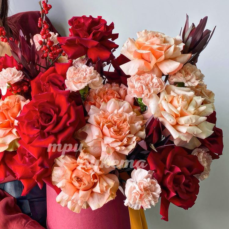 Коробка красных и персиковых французских роз