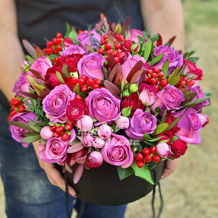 Пурпурные розы с гиперикумом в коробке