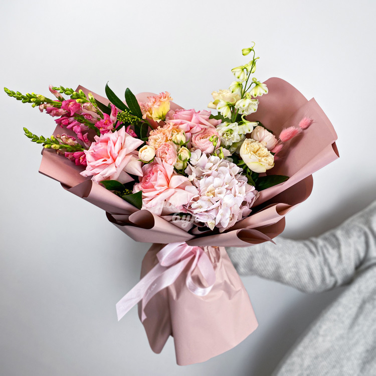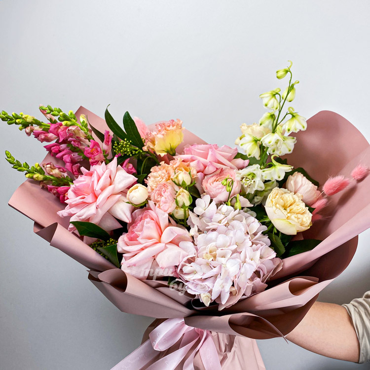 Розовый букет маттиол, роз и дельфиниума