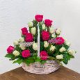 Яркая корзина гвоздик, роз и маттиол