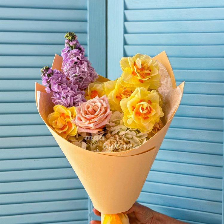 Желтый букет из нарциссов и маттиол